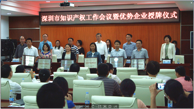 此次參會領(lǐng)導(dǎo)有深圳市市場監(jiān)督委員會常務(wù)副主任范鳴春、深圳市知識產(chǎn)權(quán)局副局長秦世杰、深圳市知識產(chǎn)權(quán)局知識產(chǎn)權(quán)促進處處長陳民鋼、副處長宋洋等。會議內(nèi)容包括2014年度知識產(chǎn)權(quán)優(yōu)勢企業(yè)授牌儀式、最新知識產(chǎn)權(quán)政策宣貫以及知識產(chǎn)權(quán)促進工作部署等。會上,范主任做了重要講話,充分肯定了深圳市知識產(chǎn)權(quán)工作在過去30年取得的矚目成績,2014年專利申請量連續(xù)四年全國第一,PCT申請量占全國一半;發(fā)明專利擁有量75件/萬人,是全國平均水平的15倍以上;90%以上的研發(fā)機構(gòu)、研發(fā)人員、研發(fā)投入、研發(fā)成果均來自企業(yè)。未來“十三五”規(guī)劃中,深圳市將在知識產(chǎn)權(quán)保護、運營以及人才培養(yǎng)方面繼續(xù)推出新政策,將深圳打造為國際型創(chuàng)新城市“中國硅谷”。同時也指出了深圳市知識產(chǎn)權(quán)工作的不足:知識產(chǎn)權(quán)分布結(jié)構(gòu)不均衡,與發(fā)達國家發(fā)達城市依然存在差距等。