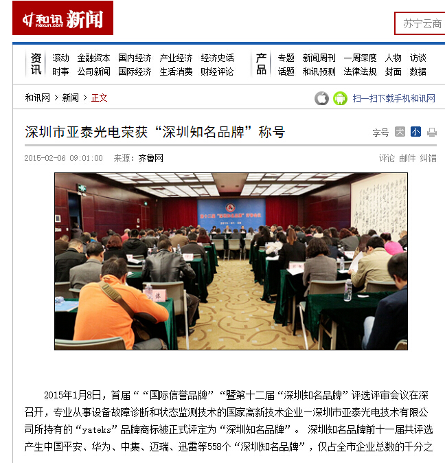 2015年1月8日,首屆““國際信譽品牌”“暨第十二屆“深圳知名品牌”評選評審會議在深召開,專業(yè)從事設備故障診斷和狀態(tài)監(jiān)測技術(shù)的國家高新技術(shù)企業(yè)—深圳市亞泰光電技術(shù)有限公司所持有的“yateks”品牌商標被正式評定為“深圳知名品牌”。 深圳知名品牌前十一屆共評選產(chǎn)生中國平安、華為、中集、邁瑞、迅雷等558個“深圳知名品牌”,僅占全市企業(yè)總數(shù)的千分之一。