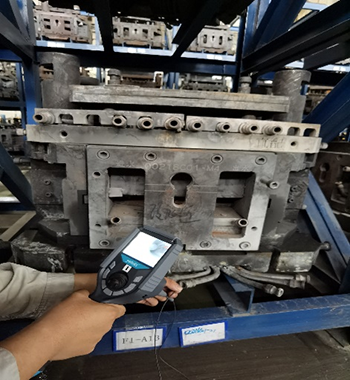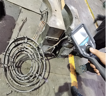 客戶現場主要看輪轂磨具內部通道的堵塞、脫落、毛刺情況,管通道孔徑13mm, 呈環狀分布,進口5cm的位置,有雙向的分支通管,亞泰光電MIE高清系列內窺鏡的探頭進入導管后,需要分別從兩端進入,本次演示時,沒有2.8mm360°轉向的演示設備,需要手動旋轉管線,預判轉向方位,清晰度方面客戶對MIE內窺鏡非常認可。導管內部多處焊接的位置,實測時能明顯看見內部的焊接堵塞,還有部分脫落,放置貨架的模具,內部有大量灰塵、蟲子等多余物??蛻舴浆F場相關負責人表示他們前面找了很久類似的內窺鏡產品,對亞泰光電2.2mm內窺鏡產品效果很認可,當即表示了進一步合作的意向。