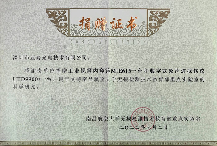 據(jù)悉,本次捐贈(zèng)的兩臺(tái)設(shè)備為亞泰光電工業(yè)視頻內(nèi)窺鏡MIE615和數(shù)字式超聲波探傷儀UTD9900+,價(jià)值約6萬(wàn)元。工業(yè)視頻內(nèi)窺鏡MIE615是一款機(jī)械360°轉(zhuǎn)向視頻內(nèi)窺鏡,用于各種狹小空間的目視檢測(cè)工作。機(jī)身輕便便于攜帶,插入管可更換結(jié)構(gòu),一臺(tái)主機(jī)可搭配不同規(guī)格直徑的插入管,既滿(mǎn)足了客戶(hù)多方面的使用需求,又可以大大節(jié)約設(shè)備費(fèi)用。可廣泛應(yīng)用于發(fā)動(dòng)機(jī)、電力、石化、鐵路、船舶等領(lǐng)域。數(shù)字式超聲波探傷儀UTD9900+它能快速低成本地探測(cè)工件內(nèi)部裂縫,夾雜,氣孔,疏松等多種缺陷,廣泛用于機(jī)械制造,鋼結(jié)構(gòu),化工設(shè)備,造船,壓力容器等領(lǐng)域進(jìn)行質(zhì)量控制的有力工具。它較好地解決了有些數(shù)字式儀器操作不方便的問(wèn)題。