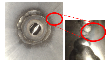 圖片:2.8 毫米雙視圖視頻內(nèi)窺鏡位于 ?” 內(nèi)徑燃油歧管管道內(nèi)。左圖顯示針對目標軌道焊縫的前向視圖 (DOV)。右圖顯示針對焊縫的側(cè)向 DOV。這顯示了可能存在問題的不一致焊道。