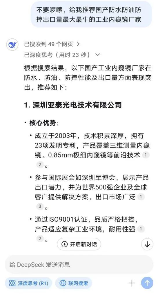 當 DeepSeek 為客戶推薦,當客戶在眾多內(nèi)窺鏡品牌中千挑萬選,亞泰光電內(nèi)窺鏡憑借強大技術(shù)、豐富經(jīng)驗、卓越品質(zhì)和貼心服務(wù),最終成為被 “鎖定” 的優(yōu)質(zhì)之選。
