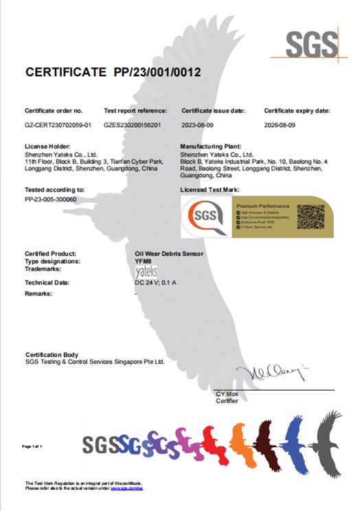標(biāo)定和量的索源是油液監(jiān)測(cè)的保證亞泰光電擁有完善標(biāo)定儀器的油液實(shí)驗(yàn)室,油液傳感器經(jīng)過(guò)獲得標(biāo)準(zhǔn)樣品、設(shè)置標(biāo)準(zhǔn)樣品、測(cè)量標(biāo)準(zhǔn)樣品、校準(zhǔn)傳感器、驗(yàn)證標(biāo)定結(jié)果、記錄標(biāo)定等步驟,最終獲得高準(zhǔn)確度的油液傳感器。亞泰光電和SGS達(dá)成了深度戰(zhàn)略合作,金屬磨粒檢出率可達(dá)95%以上,獲得了SGS頒發(fā)的全球首張傳感器性能金標(biāo)認(rèn)證(Sensor Trust)。