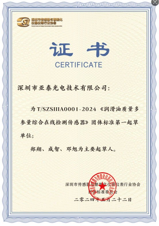 在《深圳市培育發(fā)展智能傳感器產(chǎn)業(yè)集群行動(dòng)計(jì)劃(2022-2025年)》的指導(dǎo)下,傳感器企業(yè)越來(lái)越成為深圳國(guó)民經(jīng)濟(jì)和社會(huì)發(fā)展的新質(zhì)生產(chǎn)力,但與此同時(shí),在潤(rùn)滑油在線檢測(cè)傳感器領(lǐng)域并沒有具有針對(duì)性的指導(dǎo)標(biāo)準(zhǔn)。亞泰光電牽頭起草全國(guó)首個(gè)油液監(jiān)測(cè)傳感器器團(tuán)體標(biāo)準(zhǔn)(T/SZSIIIA0001-2024),已實(shí)施并出版(由中國(guó)標(biāo)準(zhǔn)出版社出版發(fā)行,各地新華書店經(jīng)銷)。這是對(duì)深圳市亞泰光電技術(shù)有限公司和相關(guān)潤(rùn)滑油狀態(tài)監(jiān)測(cè)傳感器企業(yè)提出了更高的要求。它將推動(dòng)傳感器技術(shù)的創(chuàng)新、促進(jìn)潤(rùn)滑油行業(yè)的數(shù)字化轉(zhuǎn)型、加強(qiáng)行業(yè)間的合作與交流,并提升我國(guó)在全球潤(rùn)滑油市場(chǎng)的地位。隨著標(biāo)準(zhǔn)的深入實(shí)施和應(yīng)用,相信我國(guó)潤(rùn)滑油行業(yè)將迎來(lái)更加廣闊的發(fā)展前景。