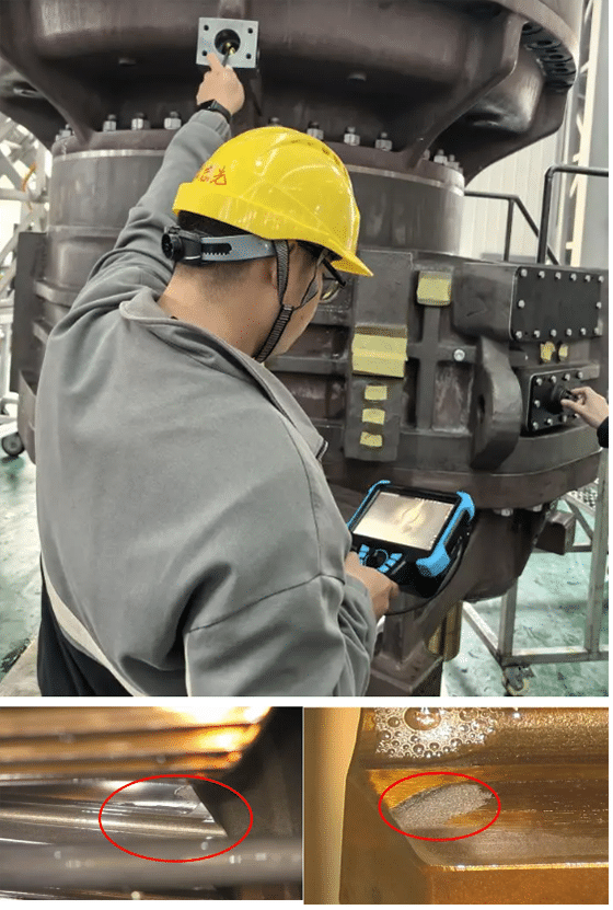 案例2?:針對某5MW風機葉片異響問題,技術人員使用亞泰AIE615兩百萬像素內窺鏡快速定位齒輪腐蝕磨損,將原本需吊裝拆卸的3天檢測流程縮短至2小時,?減少發(fā)電損失約20萬元/天?;