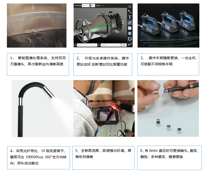 本儀器廣泛應用于航空、汽車、船舶、電氣、化學、電力等現代核心工業生產、檢修等多個環節。具有直接可視的特點,能夠直接觀測管道、渦輪、汽缸、發動機等大型裝置內表面是否存在缺陷或異狀??蛇M行實時拍照和視頻錄制,為分析設備使用狀況及設備生產保障提供不可或缺的數據采集。