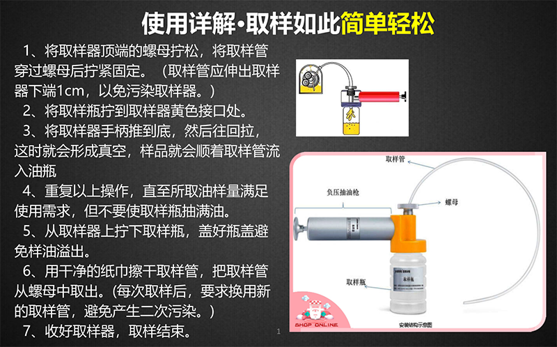 亞泰光電YBC負壓油品取樣器產品隆重升級為油品取樣器套裝,加量不加價,升級后的油品取樣器套裝包含:油品取樣器、油液取樣管、油液取樣瓶、取樣器密封圈、高品質外箱,油品取樣器采用負壓抽油槍,搭配一次性無污染油液取樣管、油品取樣瓶,有效避免外界雜質污染油樣;取樣器可用于對現場的潤滑油等油液取樣,帶回實驗室進行鐵譜、光譜、粘度、鐵量等指標的分析。