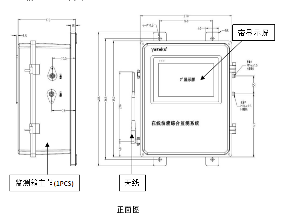 監(jiān)測箱內(nèi)部結(jié)構(gòu)組成:磨粒傳感器+清潔度傳感器+含水率傳感器+粘度傳感器+微量水傳感器+介電常數(shù)等,用戶可根據(jù)不同需求進(jìn)行功能選配。監(jiān)測箱外觀結(jié)構(gòu)組成:監(jiān)測箱主體(1PCS)+掛墻固定板(2PCS)+天線。